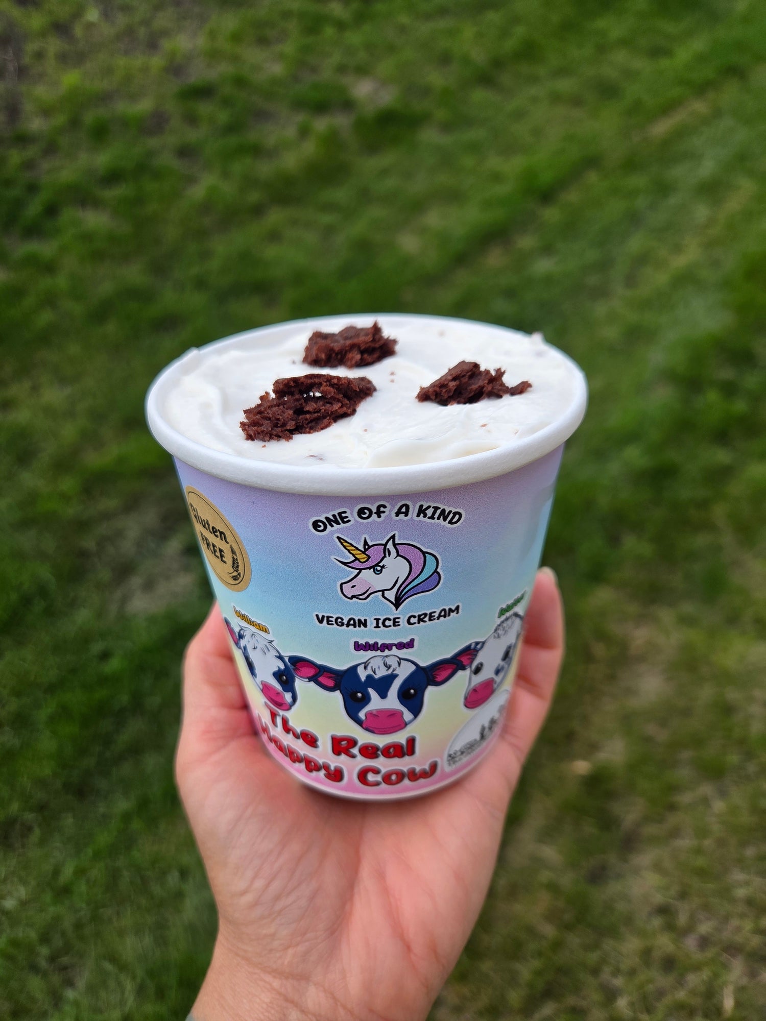 Celebrating William, Wilfred, and Walter, three sweet beautiful cows who found love and safety at The Alice Sanctuary after being rescued without their mom. A place where they can grow-up surrounded by care and compassion. A tasty French Vanilla base loaded with rich chocolate brownie chunks made with Melanie Mixes brownie mix. Our unique take on cookies 'n' cream! 10% of The Real Happy Cow pint sales will be donated to The Alice Sanctuary. Gluten-friendly.